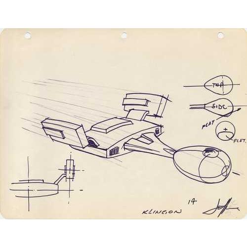 We had already established the essential character of the Klingons, so we really had more to draw on in the background than we originally had on the Enterprise. The Klingon character was different and clearly defined in several scripts. We tried to keep some of that character in the design of the ship — cold and, in a sense, vicious. We tried to get into it some of the qualities of a manta ray, shark, or bird of prey, because the Klingons follow that general feeling. Another requirement is that we had to get a feeling their ships were on par with the starships in equipment, power, size, etc. After many sketches and many evenings, it finally evolved. Everyone liked it, and that’s what we built. It was strictly an extra-curricular activity on my part.
