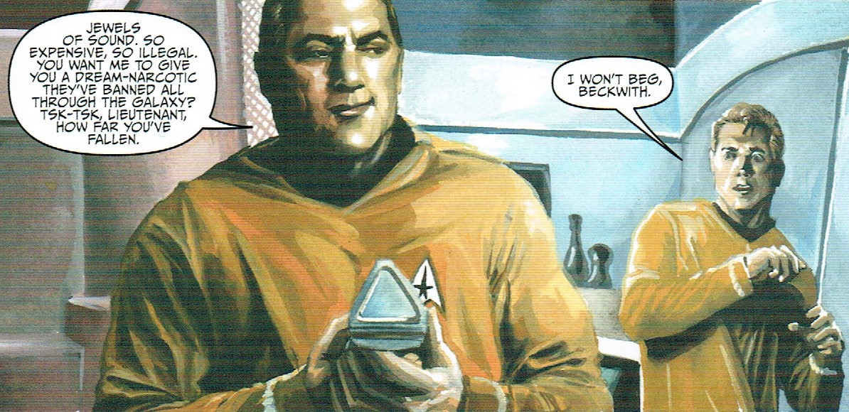 The episode opens with Beckwith, a hulking command-division officer who deals an illicit drug called The Jewels of Sound. An addicted lieutenant named LeBeque is begging the dealer for a hit. Beckwith will give him a dose, but in exchange he wants “to know about that planet out there, what the log says about valuable commodities. I’ll want a landfall pass, and I want you to cover for me when I trade with the natives.”