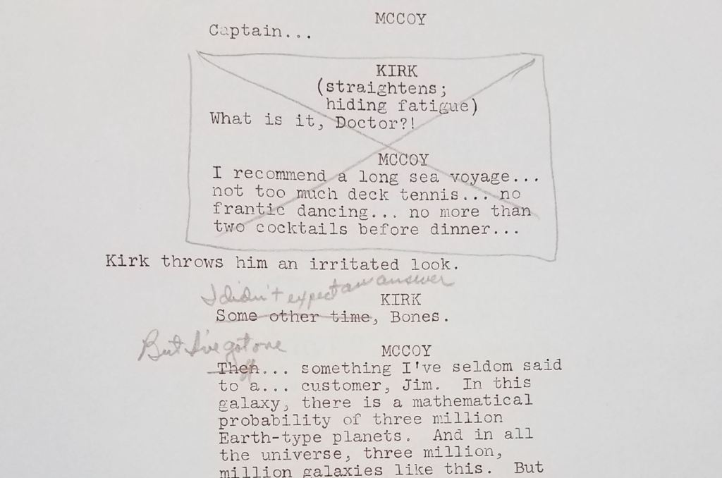 That scene was filmed on Tuesday, July 26, 1966, according to both Memory Alpha and These are the Voyages, and it was penned by Gene Roddenberry only the day before. The handwritten change was dated July 25. Writer Paul Schneider’s last script, dated July 22, 1966, had Kirk say: