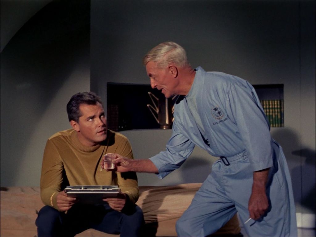 This scene is a direct call back to Captain Pike in The Cage. Following the death of three crew members on Rigel VII, he too is doubting himself and he, like Kirk, confides in the ship’s doctor in the privacy of his cabin. The scene Roddenberry wrote in 1964 worked beautifully then and worked just as well when he borrowed the idea two years later.