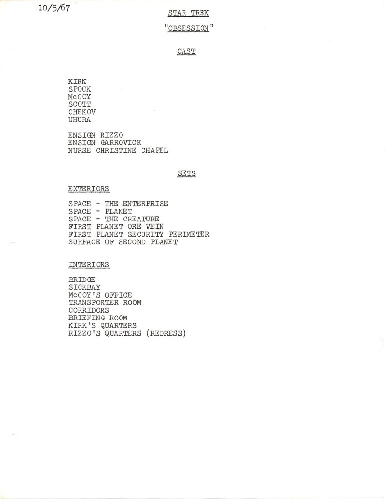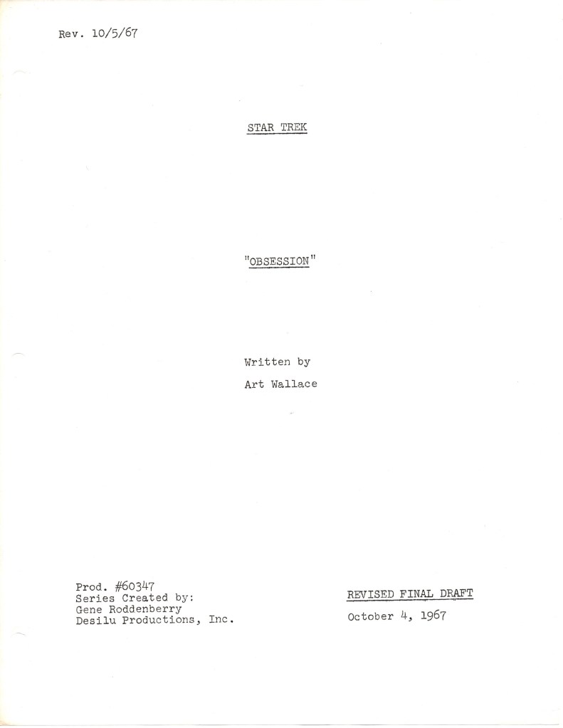 Back to Obsession. I own the Revised Final Draft script from Oct. 4, 1967. It contains pages dated between Oct. 4 and Oct. 12. Shooting on the episode began Oct. 9.