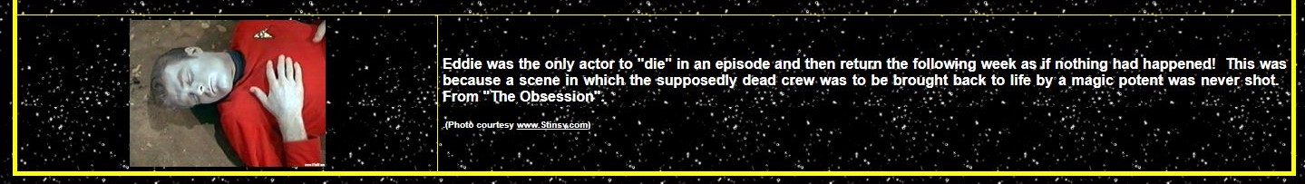 [Leslie] can be seen in nearly every episode from the first two seasons as well as a few from the third. He played many scenes as a “red shirt,” usually the first to die when exploring a planet. He is the only one though, to have died in one episode (“Obsession”) and returned in the next! This was due to the fact that a scene from the script that was never shot indicated that the victims were brought back to life!