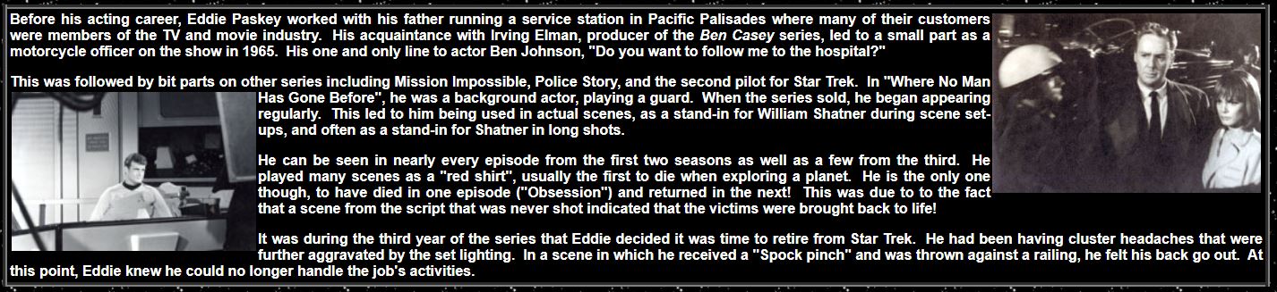 Paskey was a regular on the Star Trek sets until health problems pushed him to quit the business, following Is There In Truth No Beauty? He was in 57 episodes, mostly as a background actor, and had a line or two in four episodes. His best bit was probably in This Side of Paradise: waiting outside the transporter room to beam down, Leslie refuses Kirk’s order to return to his station and replies to the captain’s “This is mutiny, mister” with “Yes sir, it is.” Paskey also served as Shatner’s lighting stand-in and body double and as the hand double for James Doohan when Scotty testified in Wolf in the Fold.
