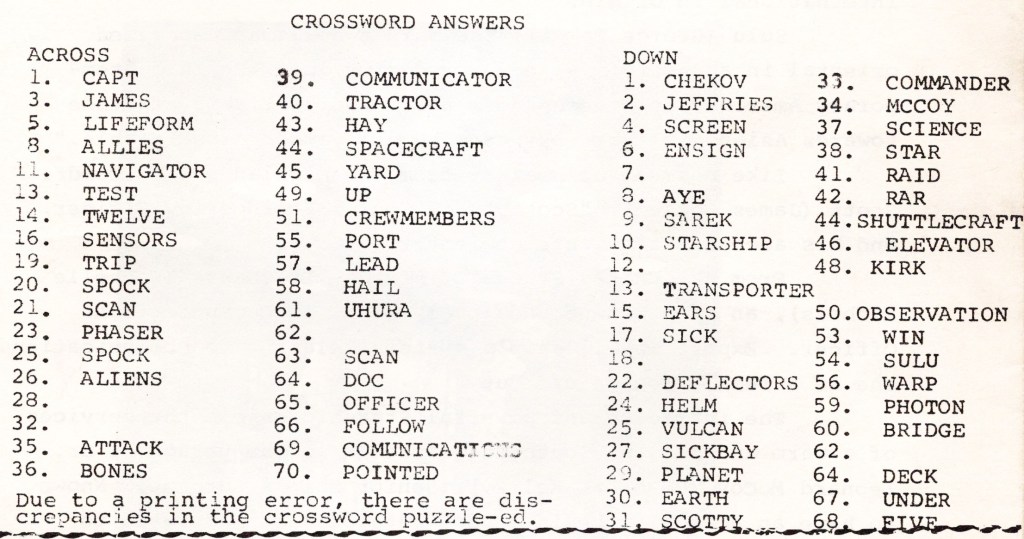 Here is the answer page, which was published in issue 12. The editor added this note: “Due to a printing error, there are discrepancies in the crossword puzzle.”