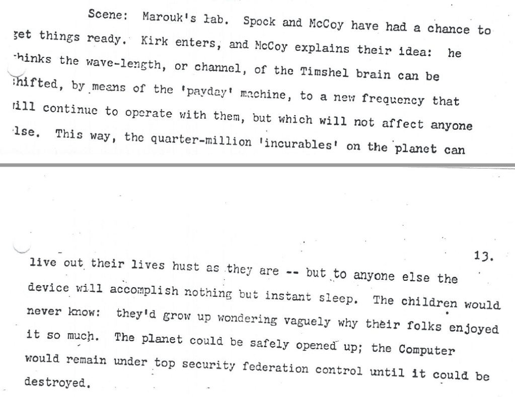 It’s not a great denouement but at least Kirk does not talk the computer to death. In Sturgeon’s outline. Now, on to the novelization.