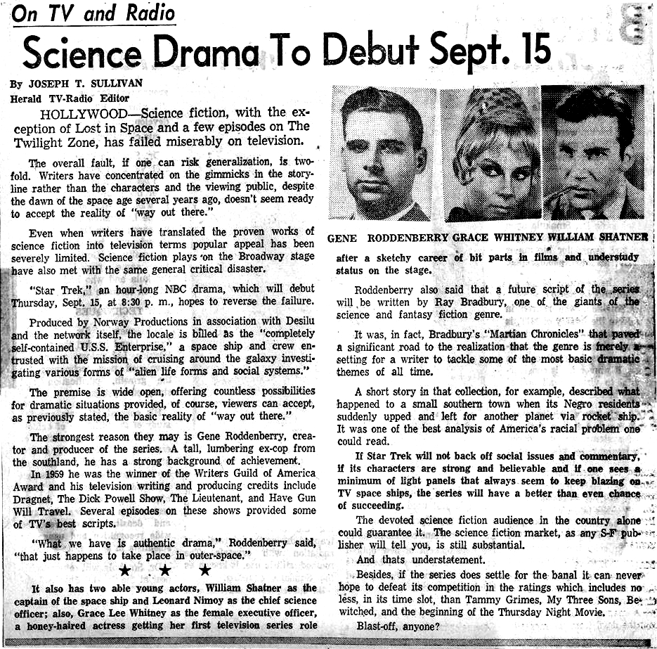 Also, an article in the Boston Herald promised that “Star Trek, an hour-long drama…will debut Thursday, Sept. 15, at 8:30 p.m.”