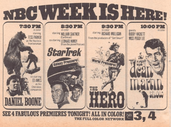 NBC held what it called NBC Week beginning on Saturday, September 10. That’s when its new shows first aired, and an ad in TV Guide promoted Star Trek‘s “Galaxy Premiere!” on September 15.