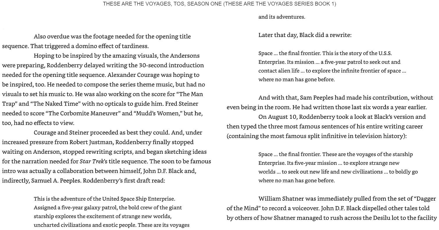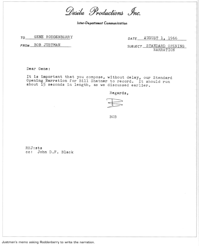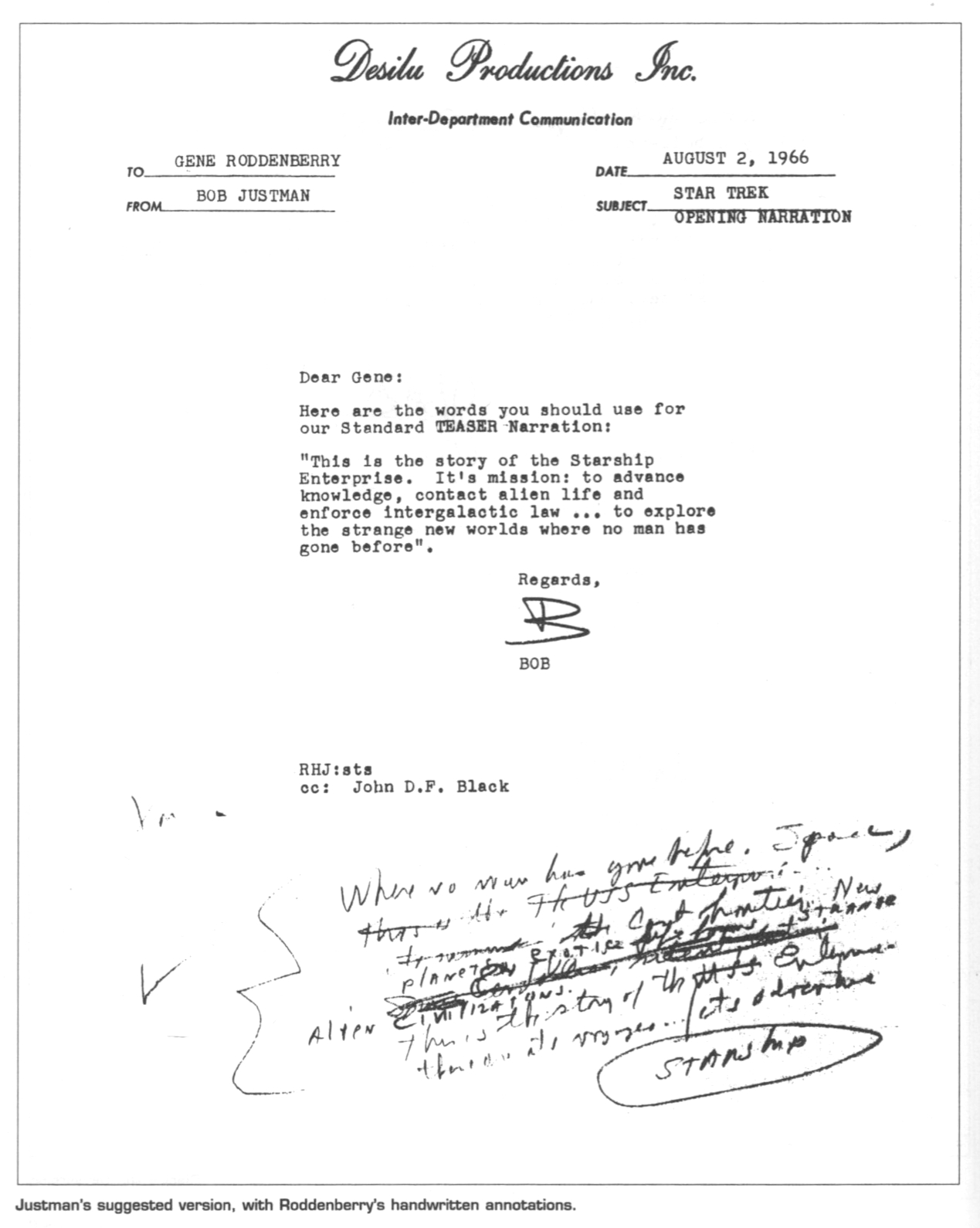 The iterations were penned by Gene Roddenberry, Bob Justman and John D.F. Black, with a big assist from Sam Peeples who had written the phrase “where no man has gone before” one year earlier.