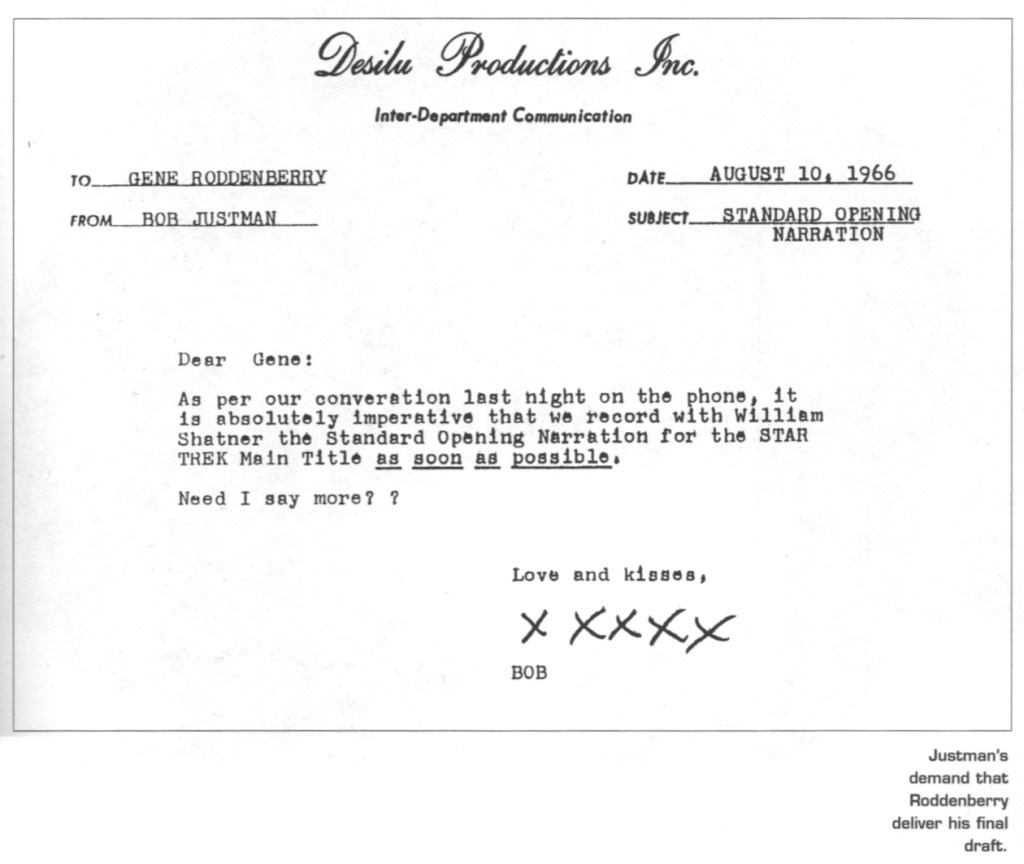 The actual writing process kicked off on August 2, 1966, following an urgent memo from Justman.