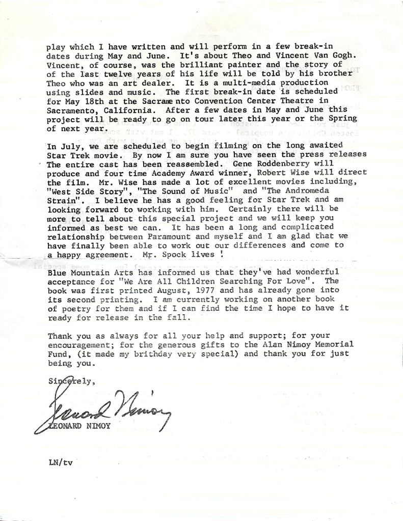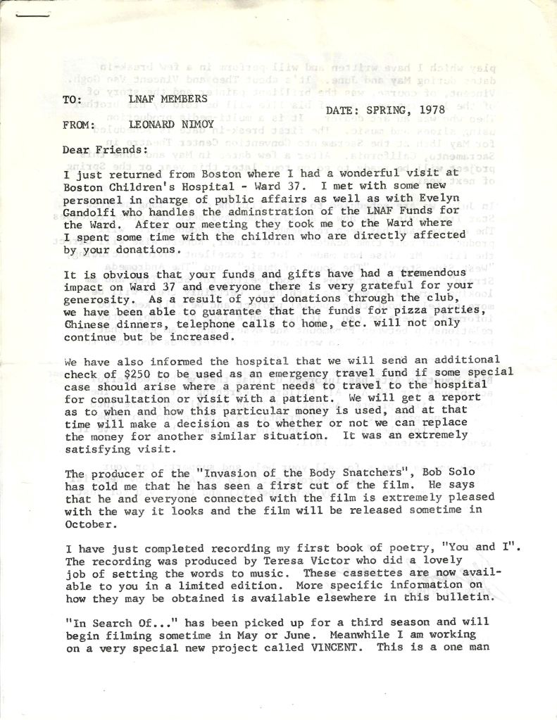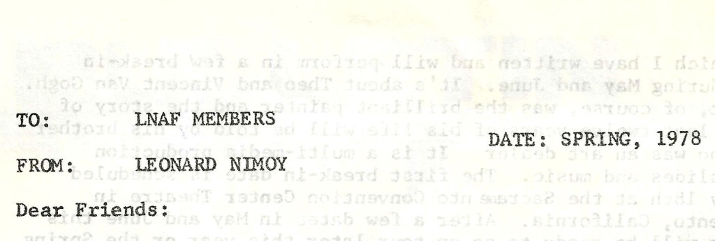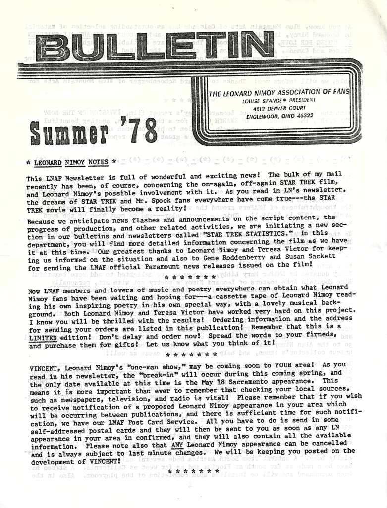 The Spring 1978 newsletter was produced by LNAF president Louise Stange, and included a letter from Nimoy to his fans. Here is a scan, followed by the highlights.