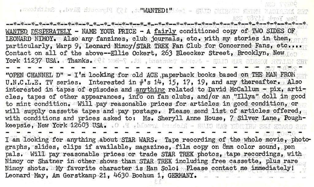 These newsletters were also a vehicle for collectibles. There are a couple of pages of people looking to buy or sell. I love Ellie Ockert’s complete lack of negotiating skills when she exclaimed “WANTED DESPERATELY – NAME YOUR PRICE.”