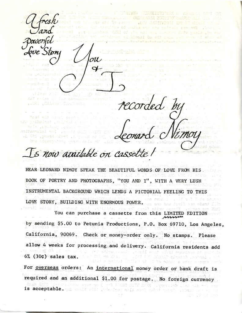 I don’t own the You and I cassette, but now I want to. Promotion was a main function of the fan clubs, and Nimoy wanted it known people could drop some money on his new cassette of poetry reading. That pitch probably worked then and it just worked now. I hit up eBay looking for one. No luck yet.