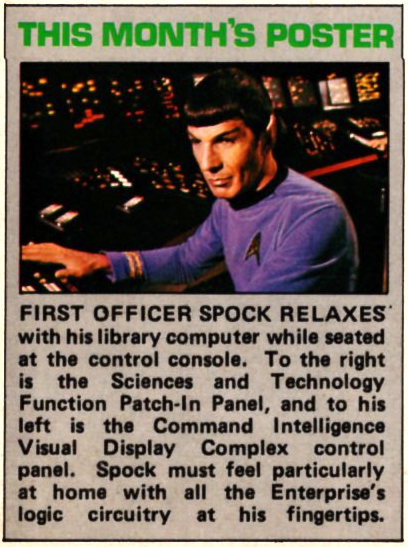 The issue closes with a pretty good trivia quiz, an ad for the Star Fleet Technical Manual and the Star Trek Blueprints ($6.95 and $5, including shipping!) and a description of Spock’s station on the bridge. Interestingly, the names assigned to the instruments are taken from the Technical Manual; they are never stated on screen.