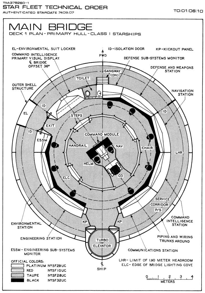 On-screen evidence can sometimes be tricky. Take the orientation of the bridge on the original-series Enterprise. The turbolift runs up the “neck” that connects the primary and secondary hulls, so the doors on the lift must be at the back of the bridge, relative to the centreline of the ship. That would locate them directly behind the command chair.