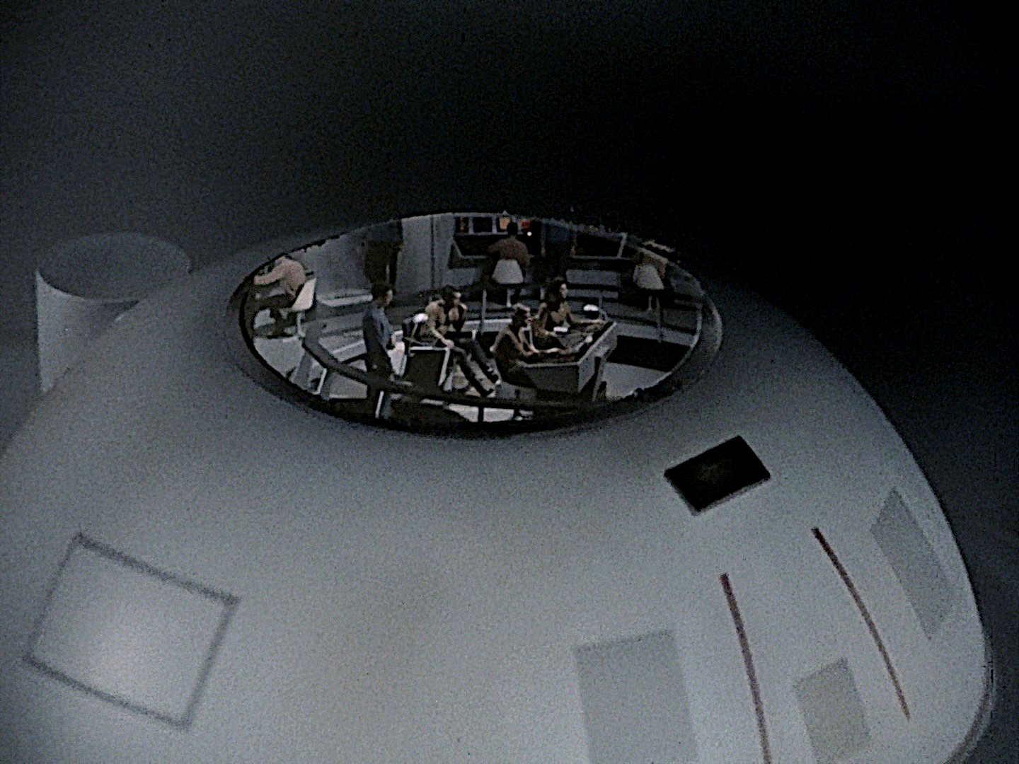 And there is one more piece of evidence. When the Enterprise encounters sudden resistance, the crew is thrown directly forward — as if the bridge is oriented along the ship’s centreline. For example, in The Immunity Syndrome the crew lurches towards the viewscreen as the ship first enters the body. Scotty staggers in from the right going in a different direction and then everyone starts flying all over the place (especially that poor guy tipping over the railing near the end) but it’s fair to say that the intent of the scene is that the bridge is oriented in line with the ship’s forward motion.